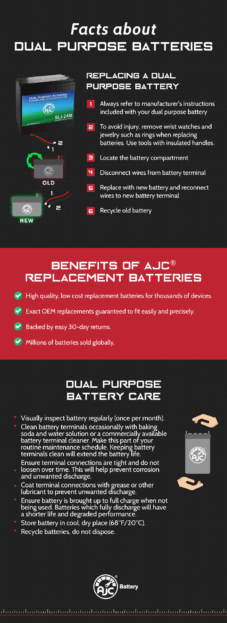 Browse our full collection of Dual Purpose Boat and Marine Replacement Batteries plus our Dual Purpose RV Replacement Batteries