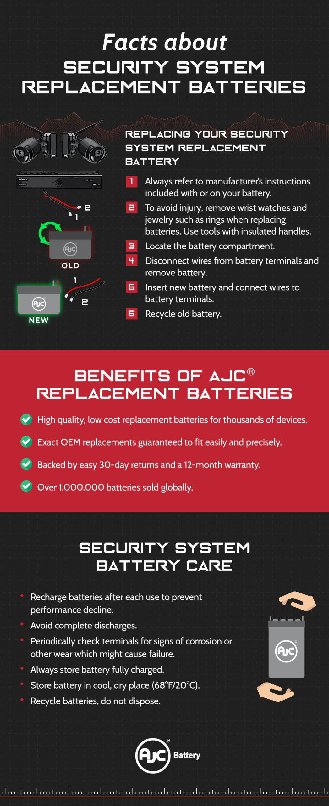 - Periodically check terminals for signs of corrosion or other wear which might cause failure.