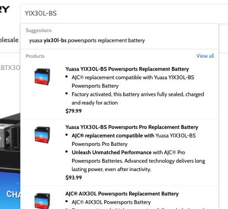 Much like a search for all other replacement batteries on BatteryClerk we suggest typing in your current battery model into the search field to see if there’s a match. For example, a search for YIX30L-BS yields several results, one of them being an AJC Pro battery.