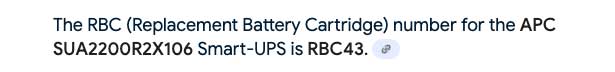 You need to identify the model number on your UPS device. Look at the back or bottom of the unit. You’ll see a sticker that will contain a model number and a serial number. APC has a useful guide on their website that helps to identify the model number. Once you have the model number, do a search to find the RBC number on their website or even Google or ChatGPT.
